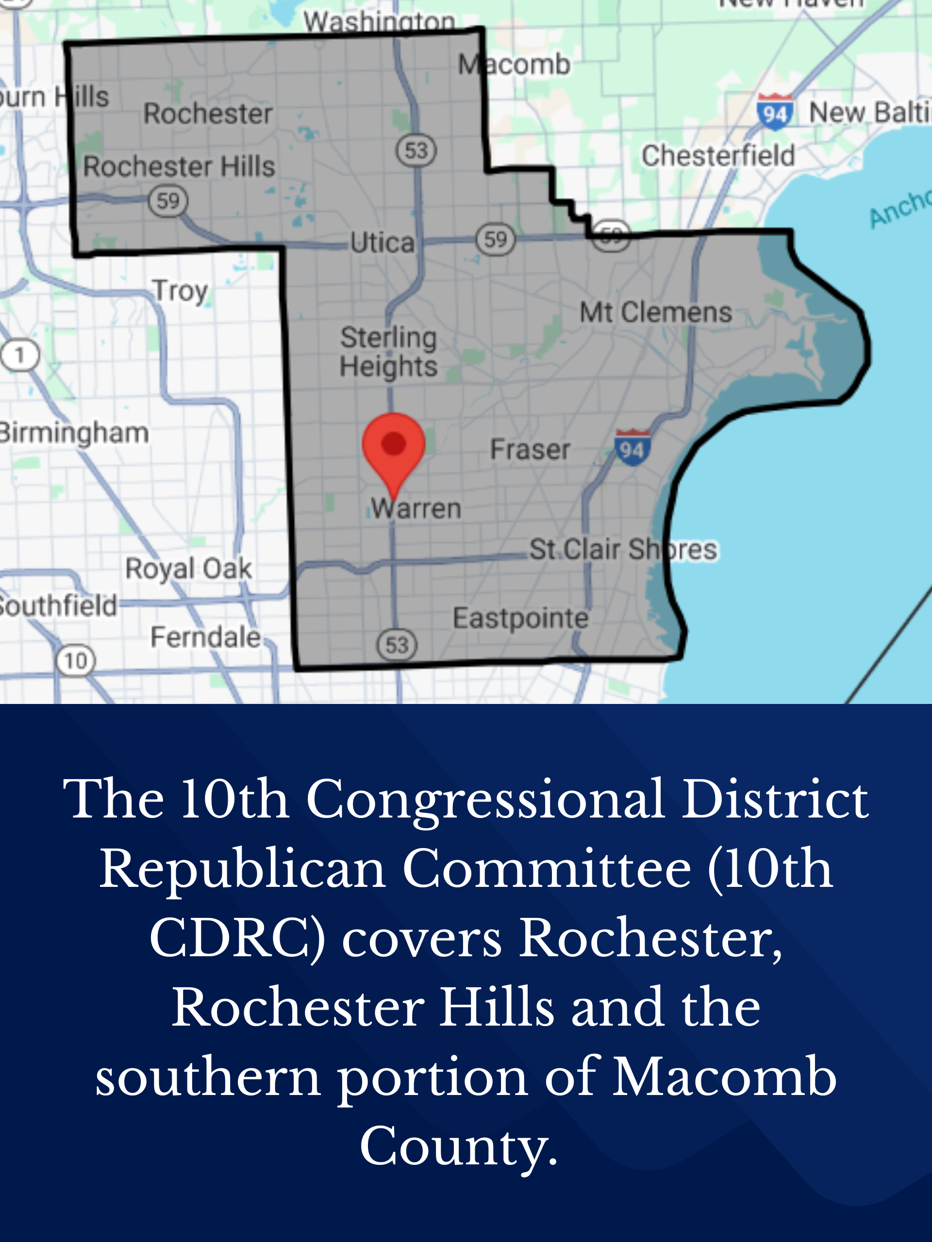 The 10th Congressional District Republican Committee (10th CDRC) covers Rochester, Rochester Hills and the southern portion of Macomb County. Our mission is to: Provide a vehicle for citizens of the 10th Congressional District to influence the direction, purposes, and goals of the Republican Party.